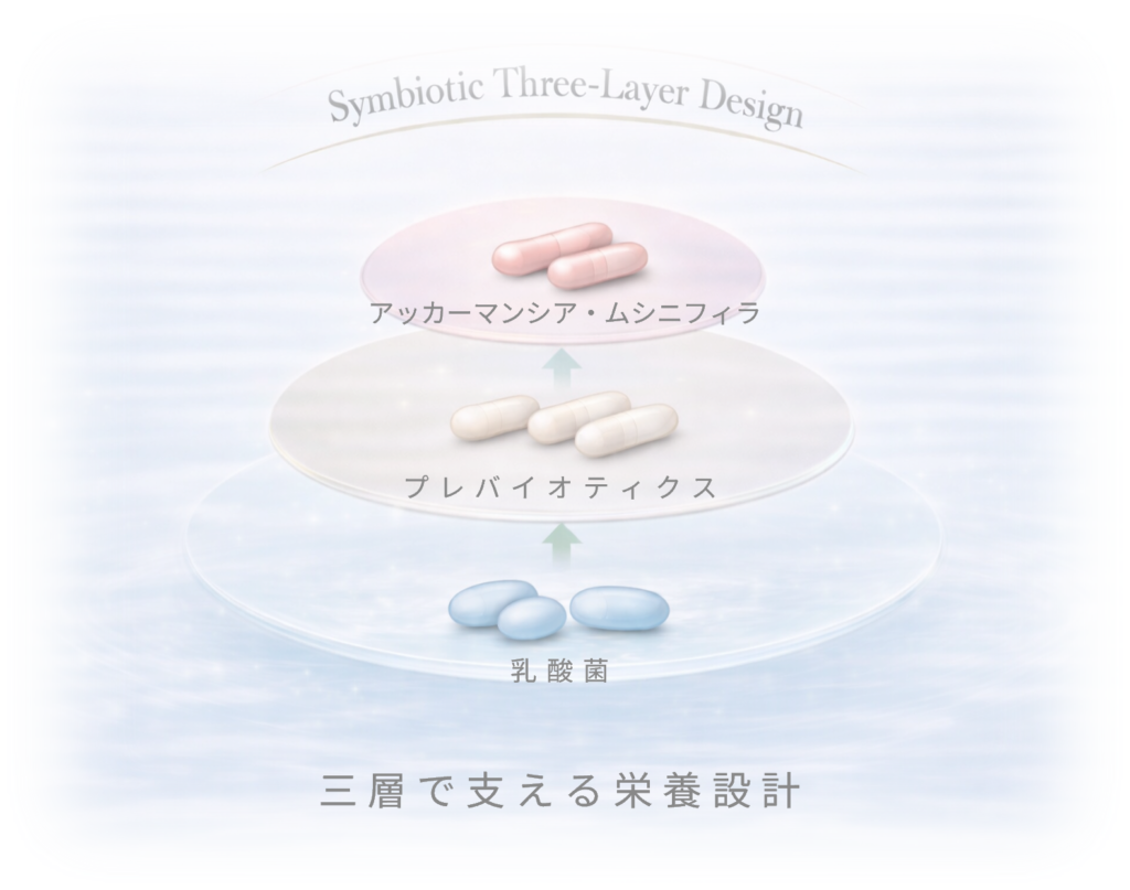 アッカーマンシア由来原料を中心に、乳酸菌やプレバイオティクスを組み合わせた配合設計により構成されています。